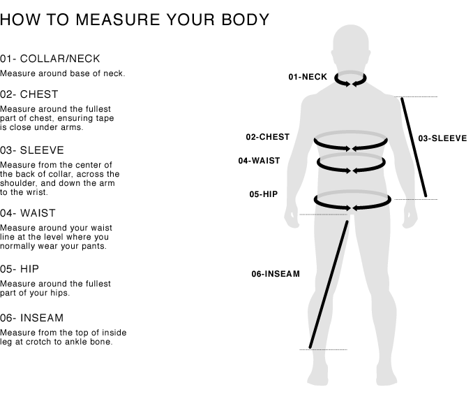 SIZE    HEIGHT (cm) CHEST (cm) SLEEVE LENGTH (cm) WAIST (cm) HIP (cm) INSEAM (cm - from inseam to ankle)
